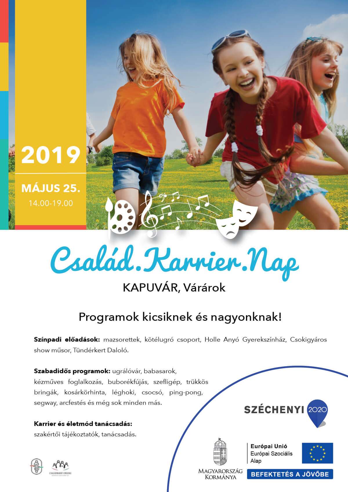 Helyszín: Kapuvár, Várárok A rendezvény programja: Színpadi előadások Szabadtéri programok Karrier és életmódtanácsadás Show allCsalád karrier nap